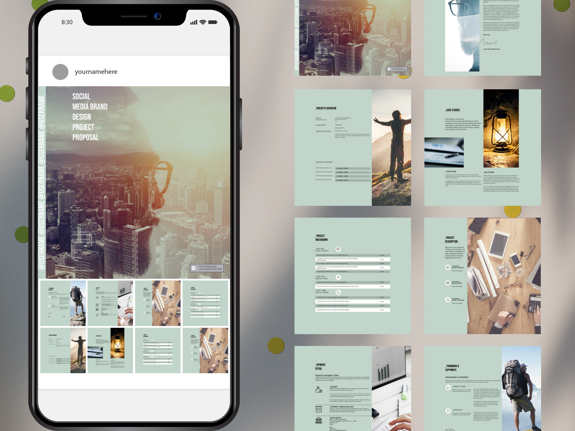 Branding Proposal Layout with Green and Yellow Accents